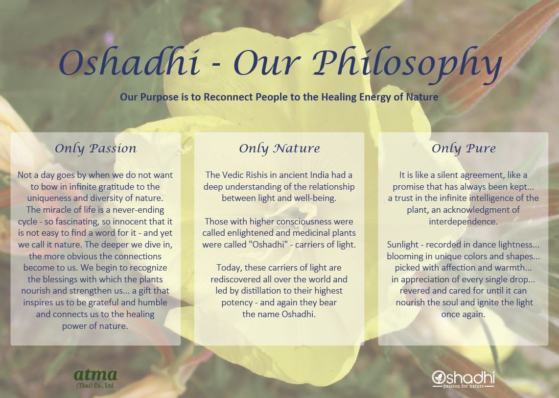 เรามีความตั้งใจที่จะเผยแพร่ประโยชน์และความรู้ของน้ำมันหอมระเหย เพราะเราอยากให้ทุกคนเข้าใจและรับรู้ถึงพลังแห่งธรรมชาติที่สามารถช่วยบำรุงรักษาสุขภาพและความเป็นอยู่ที่ดีได้ เราหวังว่าจะได้ต้อนรับคุณเข้าสู่ครอบครัว Oshadhi ผ่านหลักสูตรของเรา (บรรยายเป็นภาษาอังกฤษ) ที่กรุงเทพฯ: